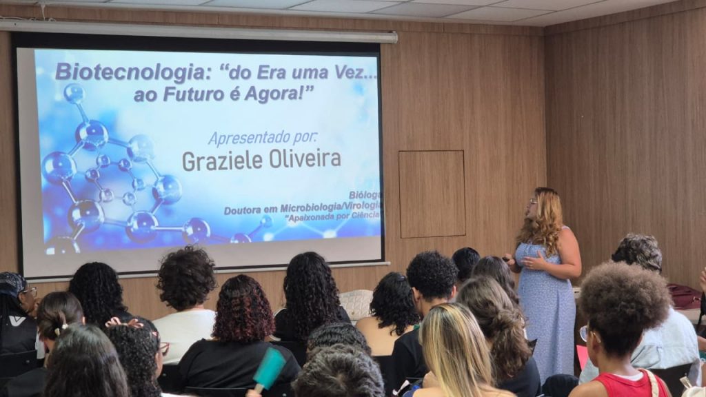 A manhã foi encerrada com uma palestra interativa sobre Biotecnologia, realizada no Miniauditório 01, ministrada pela pesquisadora Graziele P. Oliveira. A apresentação destacou a importância crescente da Biotecnologia no cenário científico, industrial, ambiental e de saúde, trazendo exemplos reais de aplicações, como desenvolvimento de biocombustíveis, produção de medicamentos, biorremediação e melhoramento genético.